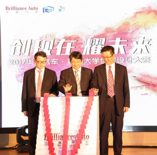 大會隨后進行了啟動儀式,陳鋒主任、劉鵬程總裁、李建新董事長共同推動多米諾骨牌,宣布2017華晨汽車·首屆大學創(chuàng)客設(shè)計大賽正式開幕。