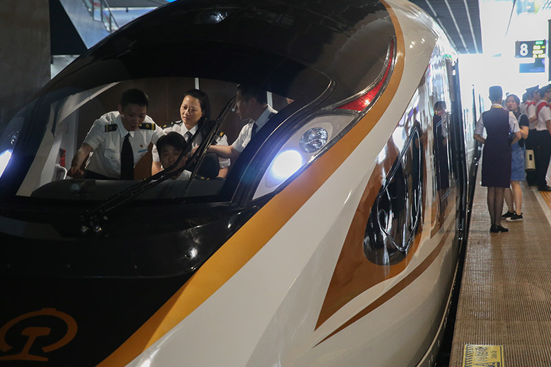 6月26日,在上海虹橋火車站,工作人員在“復(fù)興號”G124次列車駕駛艙內(nèi)進(jìn)行發(fā)車前的準(zhǔn)備。“復(fù)興號”是由中國鐵路總公司牽頭組織研制、具有完全自主知識產(chǎn)權(quán)、達(dá)到世界先進(jìn)水平的中國標(biāo)準(zhǔn)動車組。