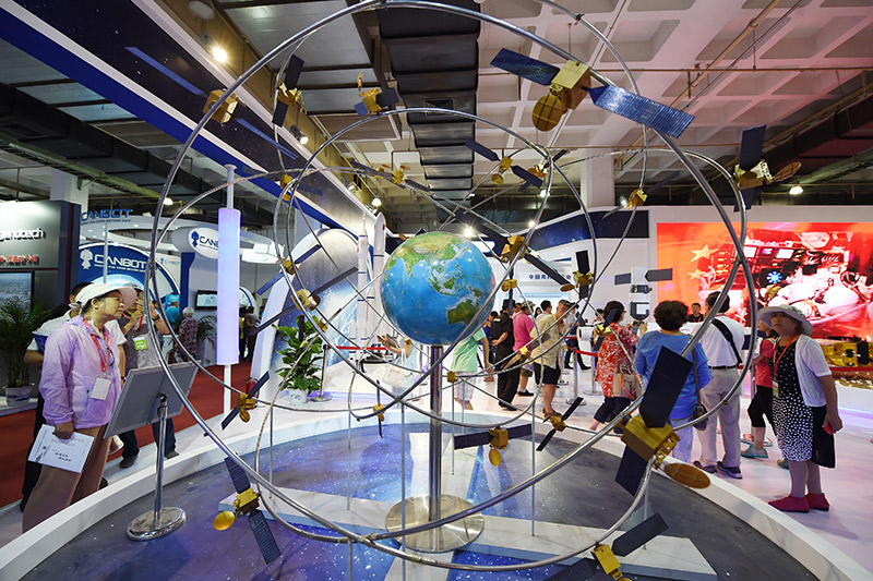 6月9日,參觀者在第二十屆中國北京國際科技產(chǎn)業(yè)博覽會上參觀展出的北斗衛(wèi)星導(dǎo)航系統(tǒng)模型。