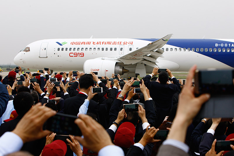 5月5日,中國首款國際主流水準(zhǔn)的干線客機C919在上海浦東國際機場首飛成功。