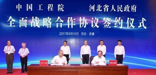 2017年8月18日上午,中國工程院與河北省人民政府在河北省承德市舉行了全面戰(zhàn)略合作簽約儀式。中國工程院黨組書記李曉紅、河北省省委副書記、省長許勤、中國工程院副院長劉旭、河北省人民政府副省長張古江、河北省人民政府副省長徐建培出席了會(huì)議。劉旭、徐建培代表院省雙方簽署了合作協(xié)議。河北省人民政府秘書長朱浩文主持了簽約儀式。