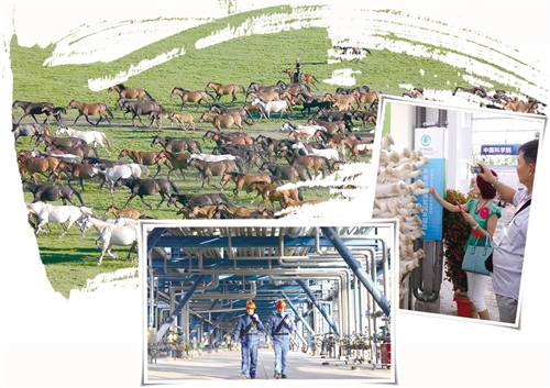 左上圖 馬的生產(chǎn)關鍵技術研究與示范項目是新疆“十二五”重大科技專項,參與該項目的牧民獲益是原來收入的5倍以上。圖為新疆昭蘇馬場培育的馬群。(資料圖片)